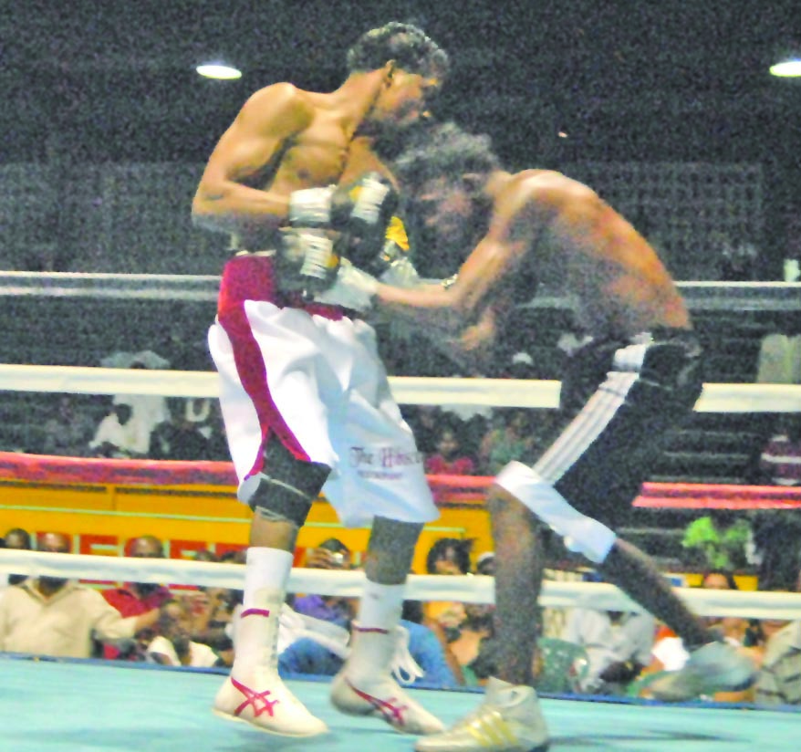 Chalton Skeete crouches as Elton Dharry gets an upper cut in