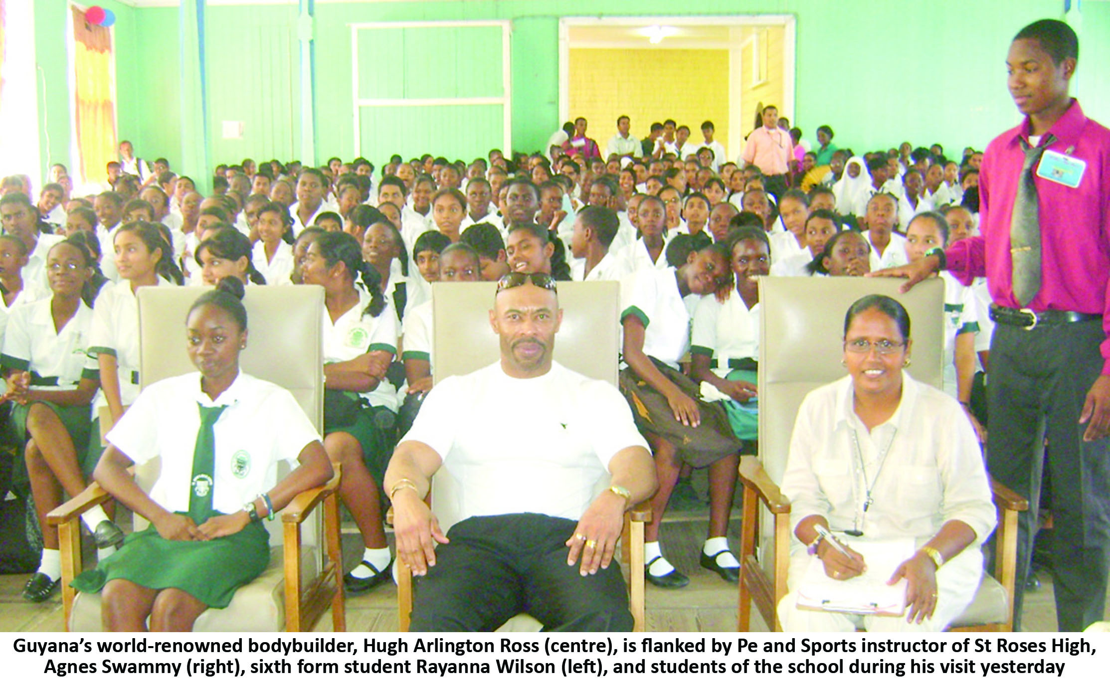 Students of St Roses High were given a bright and purposeful start to the school week when they were visited by Guyana’s world-renowned bodybuilder, the reigning Mr. Universe, Hugh Arlington Ross, who delivered a motivational talk and gave insights into his hugely successful career.
