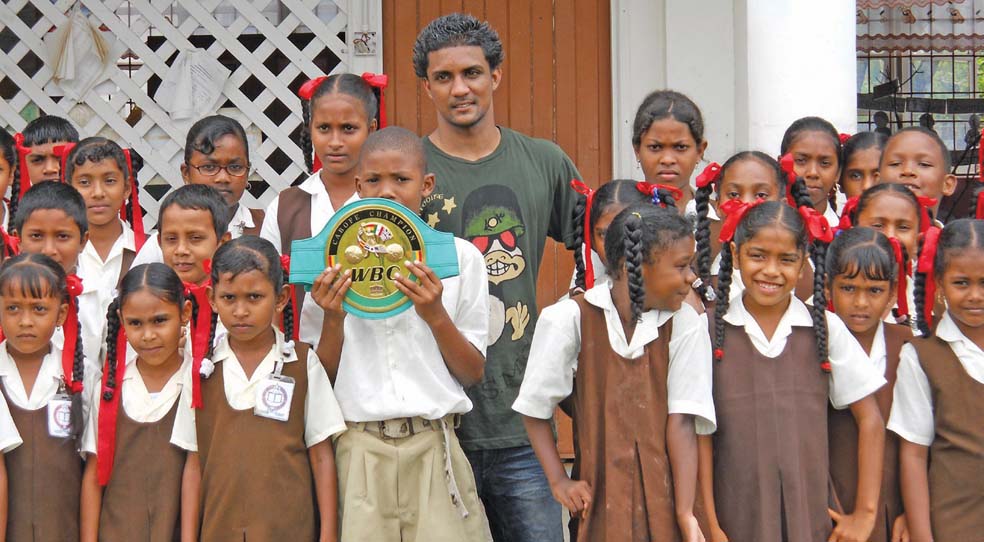 Reconnecting with his roots! The champion and students of the Richmond Hill Primary School in Leguan pose with the WBC belt on Dharry’s last visit to Guyana in February