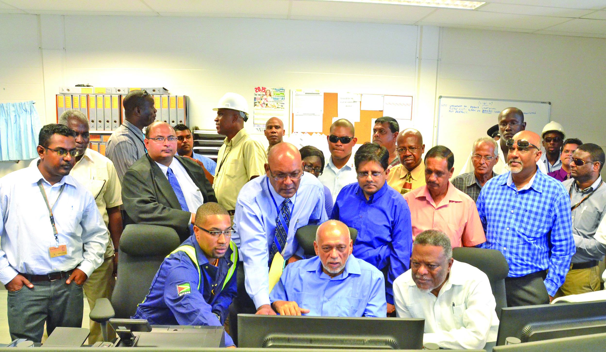 A Guyana Power and Light (GPL) engineer explaining the standard operating procedures of the newly commissioned Vreed-en-Hoop power generation plant to President Donald Ramotar and Prime Minister Samuel Hinds in the presence of GPL Chief Executive Officer (CEO) Bharat Dindyal. Also in photo are GPL Chairman Winston Brassington, Finance Minister Dr Ashni Singh, Public Works Minister Robeson Benn, Regional Chairman Julius Faerber and other officials