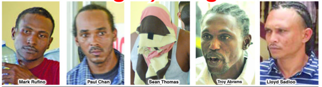 Charged for the capital offence of murder are: 25-year-old Mark Rufino, a labourer of Parika Facade, East Bank Essequibo (EBE); 37-year-old Paul Chan, called “Long Hair” or “Anthony”, a conductor of Lot 10 Dennis Street, Sophia, Greater Georgetown; 44-year-old Troy Abrams called “Rasta Man”, a vendor of Middle Street, Agricola, East Bank Demerara (EBD); 37-year-old Lloyd Sadloo, of 220 Mocha Arcadia, EBD and 41-year-old Sean Thomas, called “Yankee”, an electrician of Lot 59 William Street, Kitty, Georgetown.
