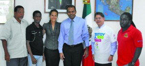 Three of the Pan Am bound athletes Cleveland Forde (second left), Nicolette Fernandes and Theodore Henry (right) in the presence of GOA VP Noel Adonis (left), Mexican Ambassador to Guyana Fernando Sandoval and Culture, Youth and Sport Minister, Dr Frank Anthony (centre)