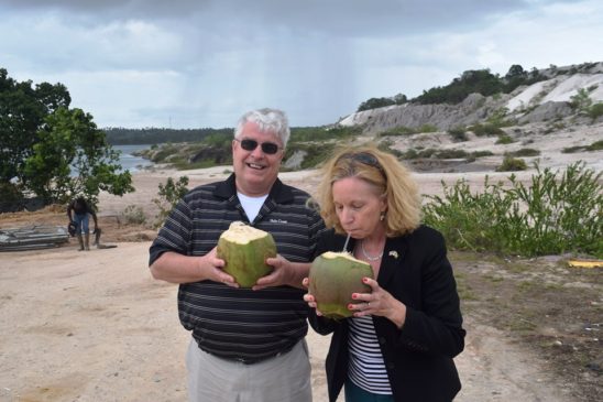 US Ambassador Sarah Ann Lynch, accompanied by her husband, made a number of stops on her recent trip to the Linden area. She visited GDF’s Camp Seweyo and the U.S. Southern Command team who are preparing for the upcoming New Horizons exercise, as well as the site of a new community center in Amelia’s Ward to be constructed by the New Horizons military engineers. She met with the Mayor of Linden, Waneka Arrindell, and discussed continued cooperation between her office and the U.S. Embassy. Before she left Linden, she had lunch at the historic Watooka House, and enjoyed fresh coconut water at the Kara Kara Blue Lake. (US Embassy photo)