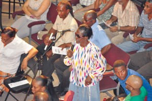 A visually impaired member of the audience poses a question to the AFC and APNU presidential candidates at the Merundoi Presidential Candidates Forum at the Theatre Guild Playhouse in Georgetown