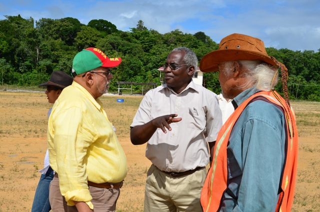 President Donald Ramotar, Minister of Public Works Robeson Benn and Technical Adviser Walter Willis in discussion during an inspection of the road under construction to the Amaila Falls