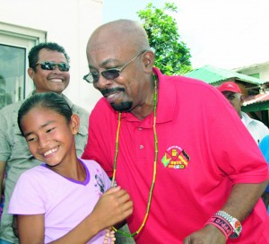 Local Government and Regional Development Minister Norman Whittaker being welcomed by a child in Moruca