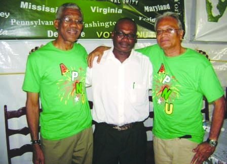 David Granger (right) and Dr Rupert Roopnaraine (left) with Denton Osbourne at the APNU rally at Corriverton