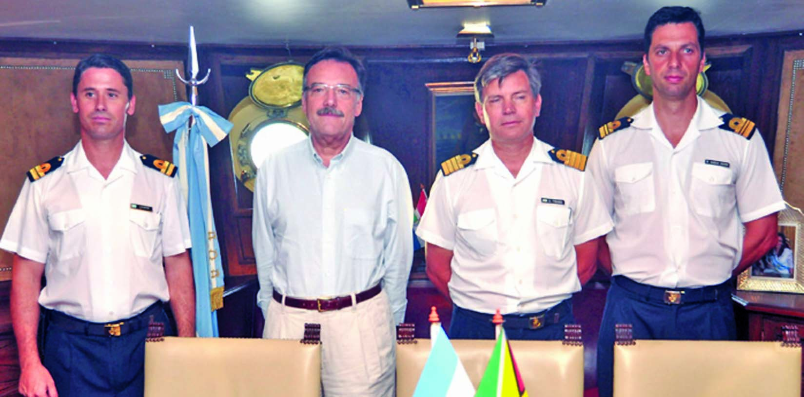 Charge d’Affaires Luis Martino (second left) stands next to the Libertad ’s captain Guillermo Tyburec (third from left) along with two other commanding officers of the ship