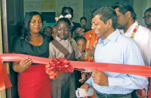 Education Minister Shaik Baksh (right) assists a pupil to cut the ribbon to officially open the Parfaite Harmonie Primary School