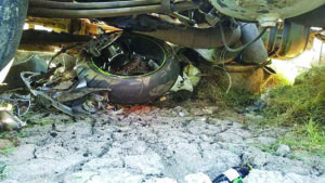 The rice truck after the accidentThe mangled motorcycle under the truck