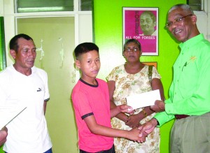 Eleven-year-old Michael Kemfume of Paramakatoi, Region Eight, last week received his bursary award, presented by the Burnham Educational Scholarship Trust (BEST) from People’s National Congress Reform (PNCR) leader David Granger.