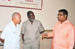 Housing and Water Minister, Irfaan Ali; Norman Mc Clean and Reunion Manganese Inc Chief Operations Officer, Joachim Bayah in discussion on the sidelines of the business luncheon hosted by the Guyana Manufacturing and Services Association at Regency Suites on Thursday, January 26