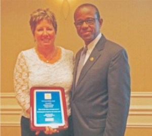 Caribbean Tourism Organisation Secretary General, Hugh Riley presents the award to Theresa Storm