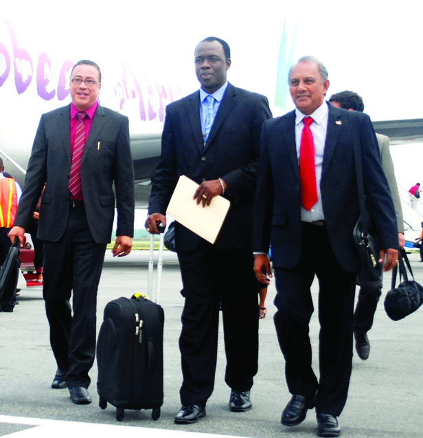 Caribbean Airlines Manager (South America) Carl Stewart (centre) welcomes Chairman Rabindra Moonan and Chief Executive Officer Robert Corbie (left) who were first off the new Boeing 767 jet, as it touched down at the Cheddi Jagan International Airport (Carl Croker photo)