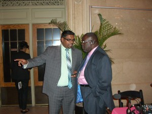 Acting Tourism Minister Irfaan Ali in conversation with U.S.-based Guyanese radio personality Bobby Viera at the event in New York