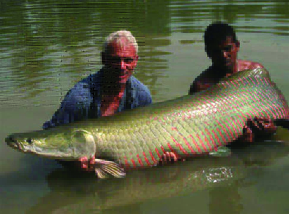 Arapaima Arapaima gigas Known as the pirarucu in Brazil and the paiche in Peru, this South America giant is one of the largest freshwater fish in the world. Some reach lengths of more than 10 feet (3 meters) and weigh upward of 400 pounds (180 kilograms). The arapaima is the focus of several conservation projects in the Guianas. The arapaima is an air-breathing fish that plies the rain forest rivers, lakes and swamps. They have a wide, scaly, gray body and a tapered head. Though arapaimas can stay underwater for…