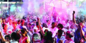 Holi is a community’s exuberant expression of joy to welcome the warmth of spring. In a refl ection of nature’s abundance, Hindus celebrate with bursts of colour, camaraderie and shared abandon. It begins on Purnima, full moon day, in the Hindu month of Phalguni (February/March) and lasts for as long as 16 days.