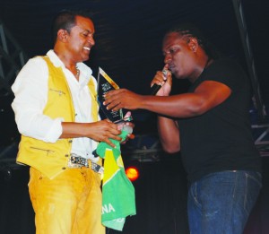 Terry Gajraj receiving an award from Hits and Jams Entertainment Director Kerwin Bollers for his outstanding contribution to the music industryRick Romotar entertaining his fansVanessa Romotar in action at the Guyana National Stadium