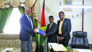 Georgetown Mayor Ubraj Narine was on Wednesday presented with a concise document, created by the European Union, in relation to the restoration of City Hall’s deplorable structure and ways in which the space can be utilised to garner independent revenues. EU Ambassador to Guyana, Jernej Videtič made the presentation to the Mayor alongside Deputy Mayor Alfred Mentor.