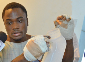 Nineteen-year-old Junior Thorrington gestures with his bandaged hands at the hospital