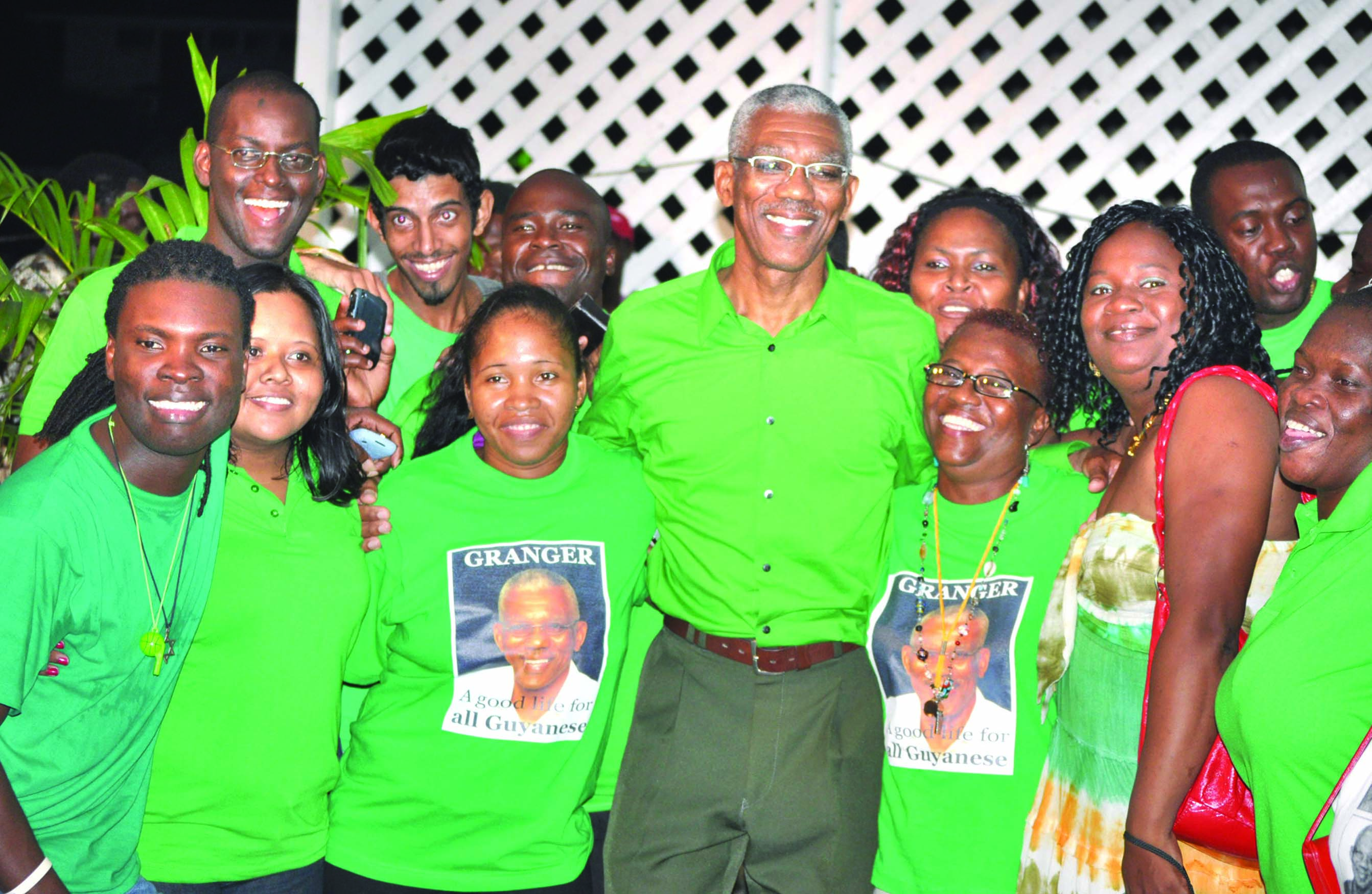 Retired Brigadier General David Granger and his supporters on Saturday celebrate his being elected the presidential candidate for People's National Congress Reform (PNCR) after a stiff contest at a special Delegates Congress at Sophia