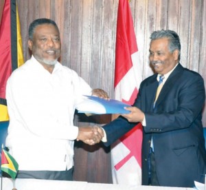First Bauxite Corporation CEO Hilbert Shields and Prime Minister Samuel Hinds exchange notes after signing the Bonasika Mineral Agreement