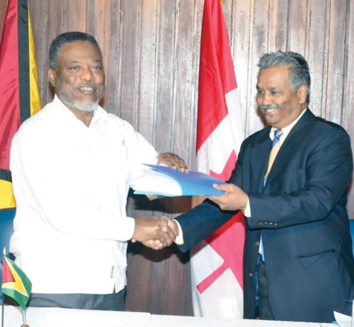 The company’s Chief Executive Officer, Hilbert Shields; Prime Minister Samuel Hinds; and the Guyana Geology and Mines Commission (GGMC) Chairman, Major General (retired) Joe Singh were signatories to a mineral agreement with the Canadian company. President Bharrat Jagdeo, Finance Minister Dr Ashni Singh and GGMC Commissioner (acting) Karen Livan were among those who witnessed the signing.