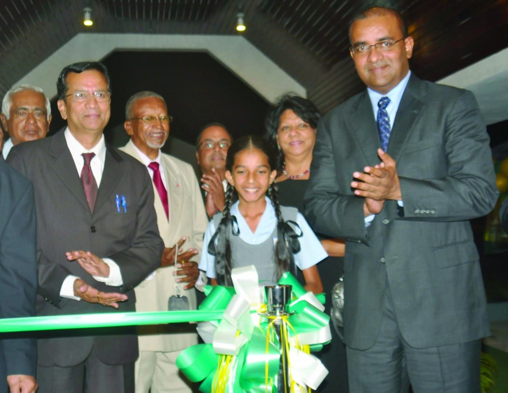 President Bharrat Jagdeo, Demerara Bank Chief Executive Officer Pravinchandra Dave and other officials applaud the opening of the bank’s Diamond branch following the ceremonial ribbon cutting by a student of Diamond Secondary School