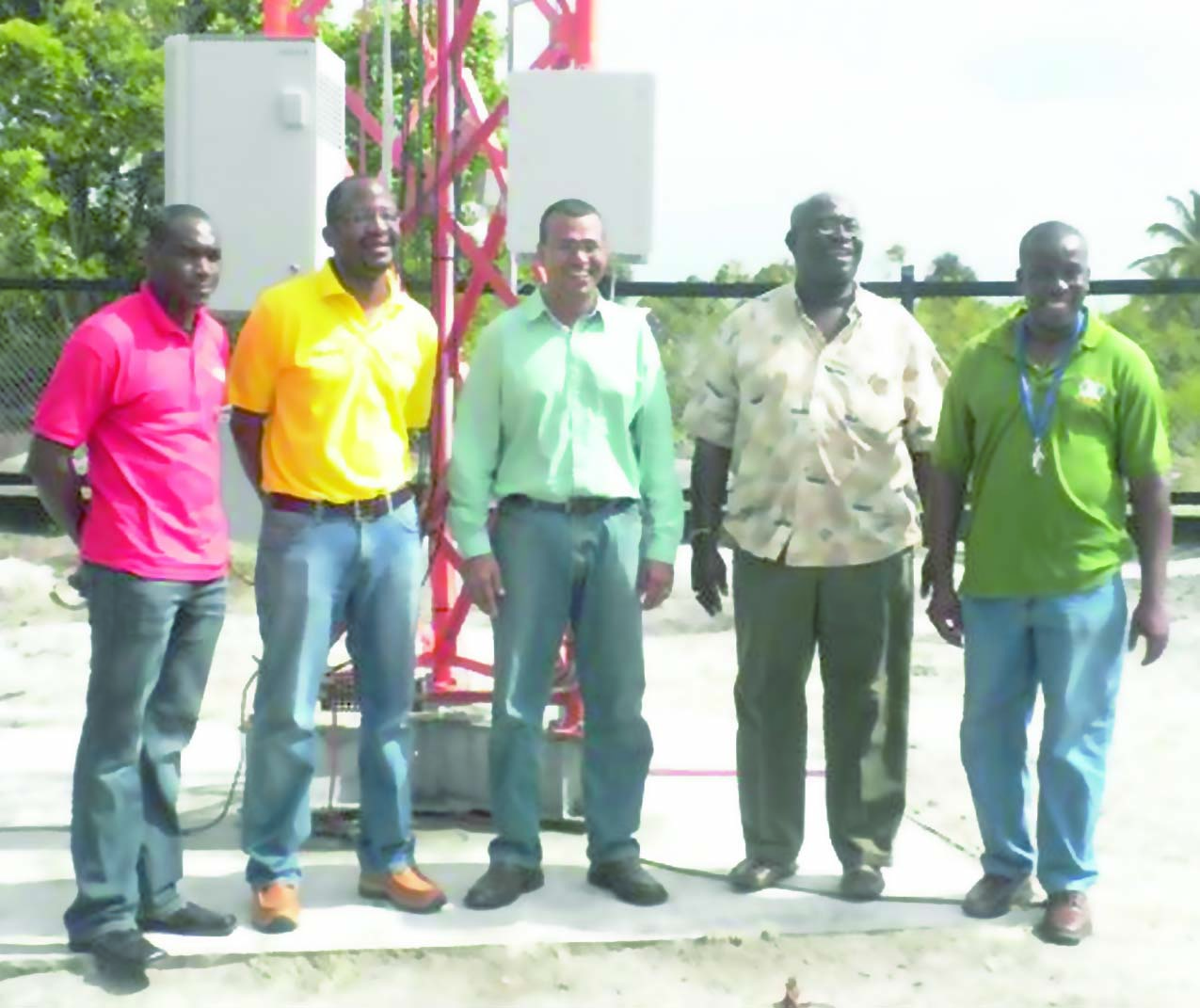 Digicel’s CEO, Gregory Dean, flanked by Agriculture Minister Robert Persaud, Regional Chairman Region Ten, Mortimer Mingo; Digicel’s Head of Technical Department Ryan Sinclair, and another, pose next to the newly-commissioned cell site at Ituni, Region Ten