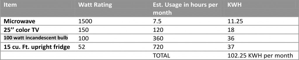 So the first thing I need you to do is to make a list of every item that uses electrical power in your house, including every appliance, every light etc. Fill them up in a table such as the one I have below, and put next to each item, the amount of power in watts that it uses. In the next column, try to estimate the number of hours that the item is used for and put that in. Finally, in a fresh column, multiply across the watt rating of the item by the number of hours and you will get a figure in watt-hours. When you have completed this, sum up the watt-hours column, divide by one thousand since one thousand watts give one kilo-watt.