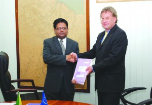 The agreements were signed by Finance Minister Dr Ashni Singh and EU Ambassador Robert Kopecky in the presence of EU representatives and other officials of the Finance Ministry. The EU had approved a project for the development of a micro-hydropower system on the Chiung River, Kato, Region Eight. The micro-hydropower system will aid in promoting the use of sustainable and climate-friendly energy.