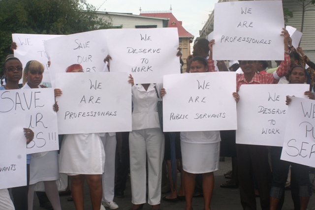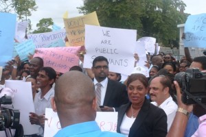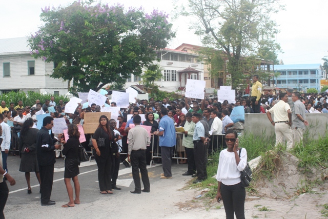 The workers assembled at the Housing and Water Ministry on Brickdam and marched to the Parliament Building where they stood for a few hours, displaying placards before dispersing. The peaceful protest was led by Housing and Water Minister Irfaan Ali and Education Minister Priya Manickchand. Transport and Hydraulics Minister Robeson Benn said that while the proposal does not adversely affect his ministry, he is in solidarity with ministries such as tourism; housing and water; and culture, youth, and sport which will be affected tremendously.