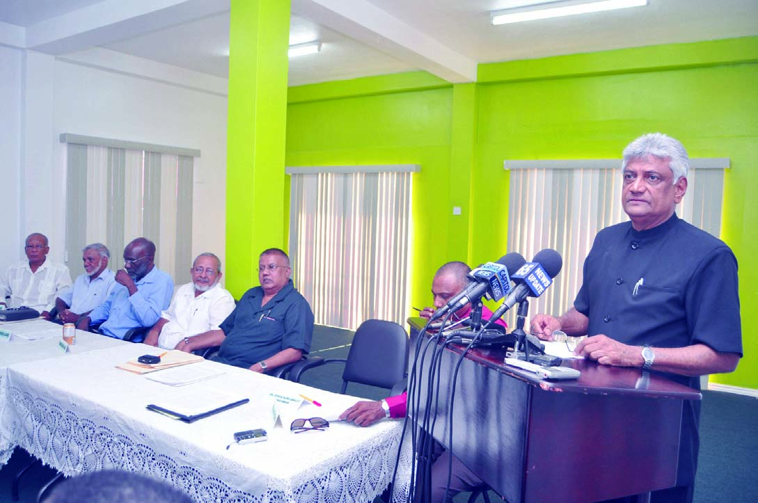 GECOM Chairman Dr Steve Surujbally addressing the media, in the presence of other members of the commission seated at the head table