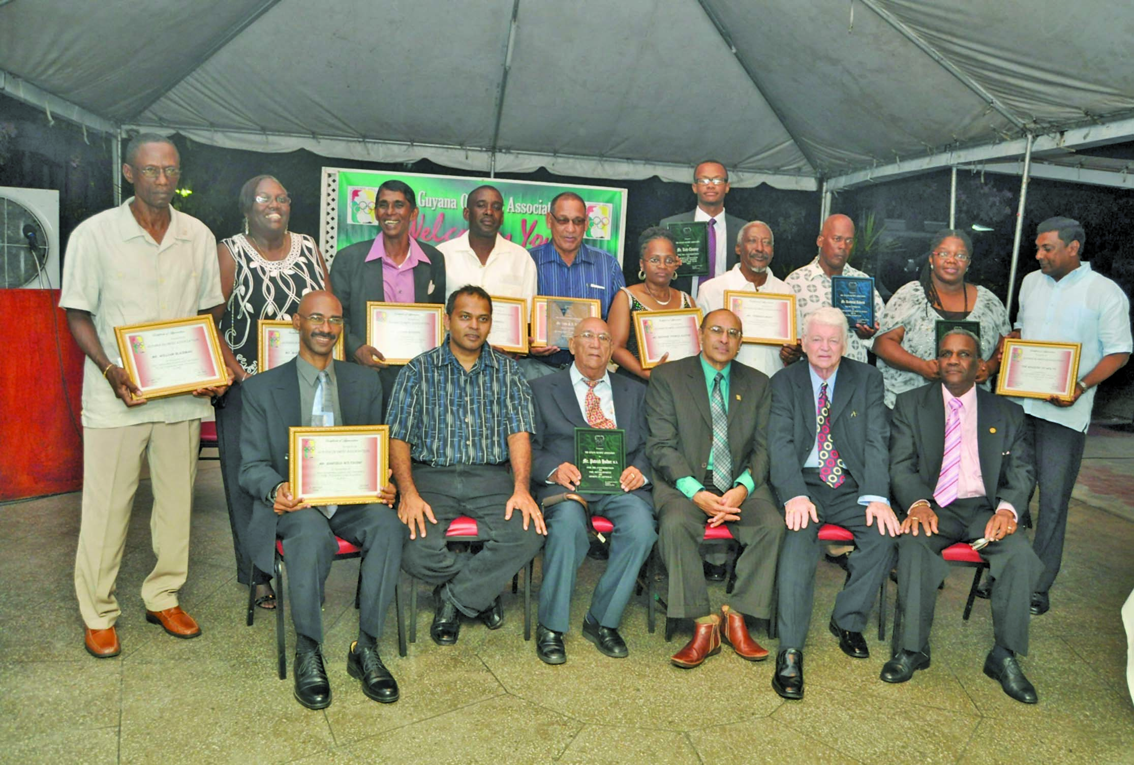 The GOA honourees pose with their awards in the presence of GOA president K A Juman Yassin (seated third right), keynote speaker Dr Ian Mc Donald (seated second right), GOA secretary general Ivor O,Brien (seated right) and Culture Youth and Sport Minister Dr Frank Anthony (seated second left)