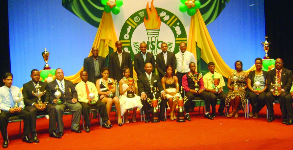 The 2010 awardees (seated) strike a pose with president Bharrat Jagdeo (centre standing) and officials of the Sport Ministry