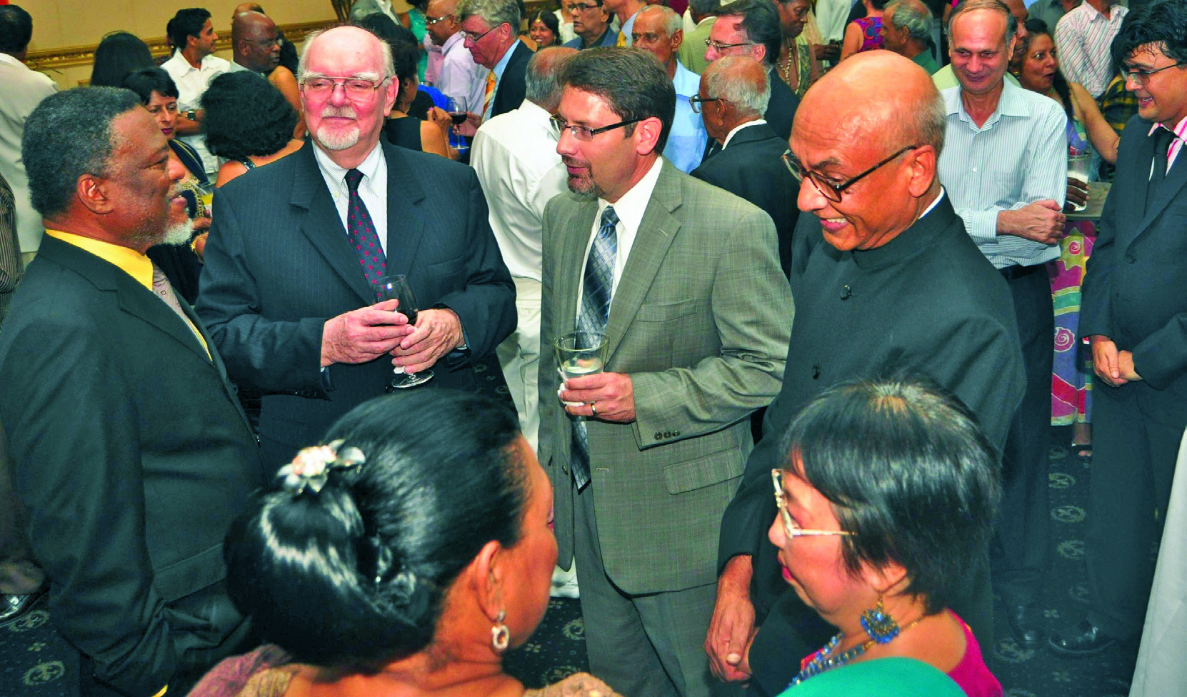 Prime Minister Samuel Hinds interacts with Charge d’Affaires of the United States embassy Thomas Pierce (second from right); Indian High Commissioner Subit Kumar Mandal (extreme right); and an official from the British High Commission