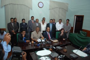File photo: Prime Minister Samuel Hinds flanked by Attorney General Anil Nandlall (left) and Home Affairs Minister Clement Rohee, with Presidential Advisor on Governance Gail Teixeira (right), briefing the media on government’s position on Rohee, at Parliament. Standing are government ministers and PPP/C parliamentarians (Carl Croker photo)