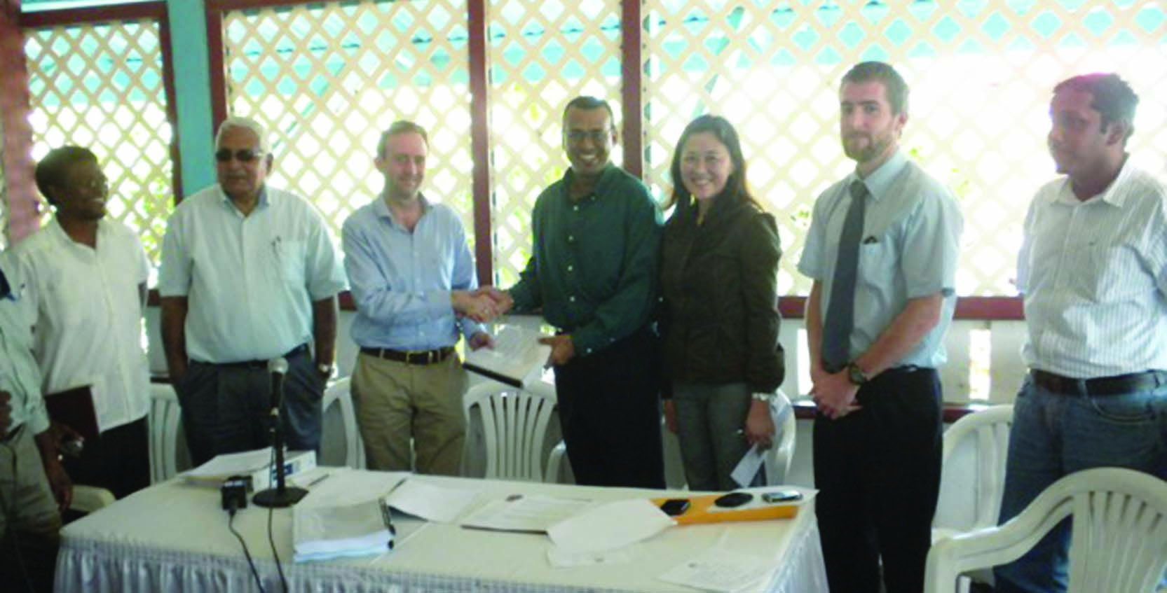 Agriculture Minister Robert Persaud (centre) hands over a copy of the contract to Project Director of Mott McDonald, Andrew Kirby. Also in photo are CEMCO Inc Managing Director Raymond Latchmansingh, NDIA CEO Lionel Wordsworth and Agriculture Ministry Senior Engineer Fredrick Flatts