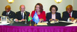 - Guyana’s High Commissioner to Canada Harry Narine Nawbatt; IOM Mission Chief Rui Reis; Foreign Affairs Minister Carolyn Rodrigues-Birkett; Honorary Consul General to Toronto Sattie Sawh and Guyana’s Ambassador to Washington, Bayney Karran at the launch