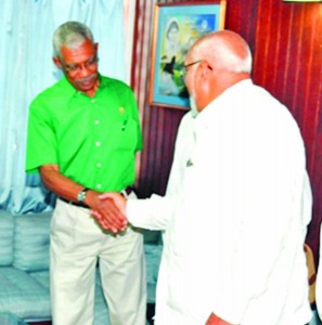 Opposition Leader David Granger and President Donald Ramotar greet each other prior to their meeting at the Office of the President on Wednesday