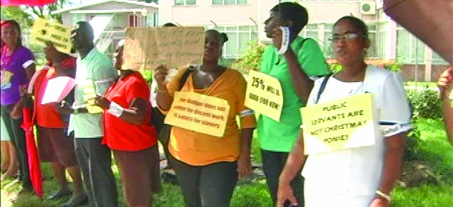 Several members of the Guyana Public Service Union (GPSU) held a peaceful picket in front of the Office of the President on Monday, demanding a proper explanation as to the reasons government is imposing a five per cent increase on public servants. Nurses, clerks and typists were among the several categories of public sector workers who joined GPSU executives in the peaceful picketing exercise, calling for a reasonable increase.