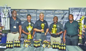 Banks DIH executives display the trophies that would be up for grabs in the Guinness in the Streets football tournament. From left are Guinness Brand Manager Lee Baptiste, Tropical Mist Brand Manager Errol Nelson, Sales and Marketing Manager Carlton Joao, Communications Manager Troy Peters and Outdoor Events Manager Mortimer Stewart (Photo: Avenash Ramzan)