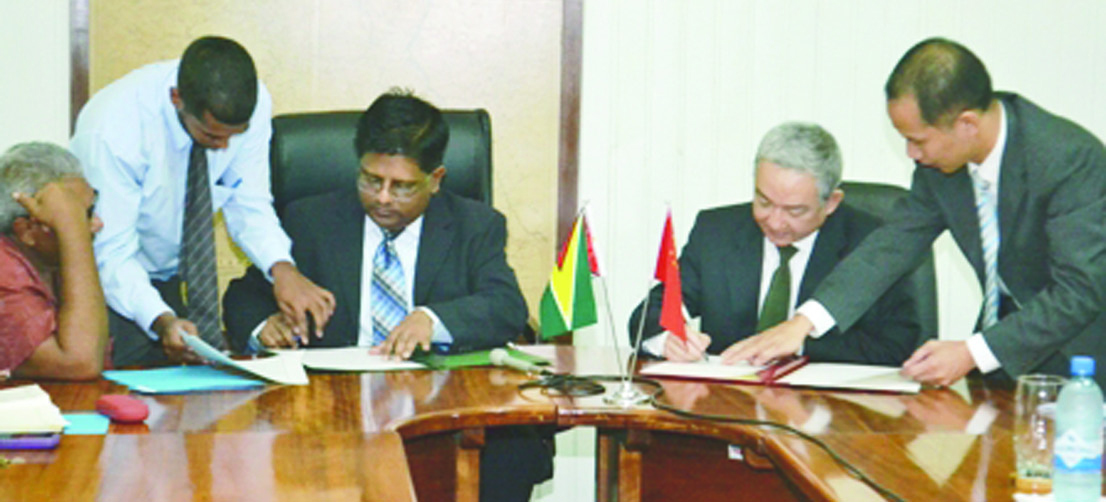 Finance Minister Dr Ashni Singh and Chinese Ambassador to Guyana Zhang Limin last Friday signed another agreement on economic and technical cooperation. Under this agreement, the government of the People’s Republic of China will provide RMB¥30,000,000 (equivalent to US$4.8 million or Gy$998 million) for the implementation of bilateral cooperation projects to be agreed upon by the two governments.