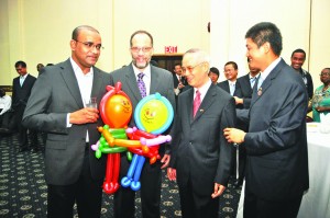 President Bharrat Jagdeo and Chinese Ambassador to Guyana Yu Wenzhe admire two balloon figures of Guyana and China at the reception. Also in photo are Caricom Secretary General Irwin LaRocque and another official