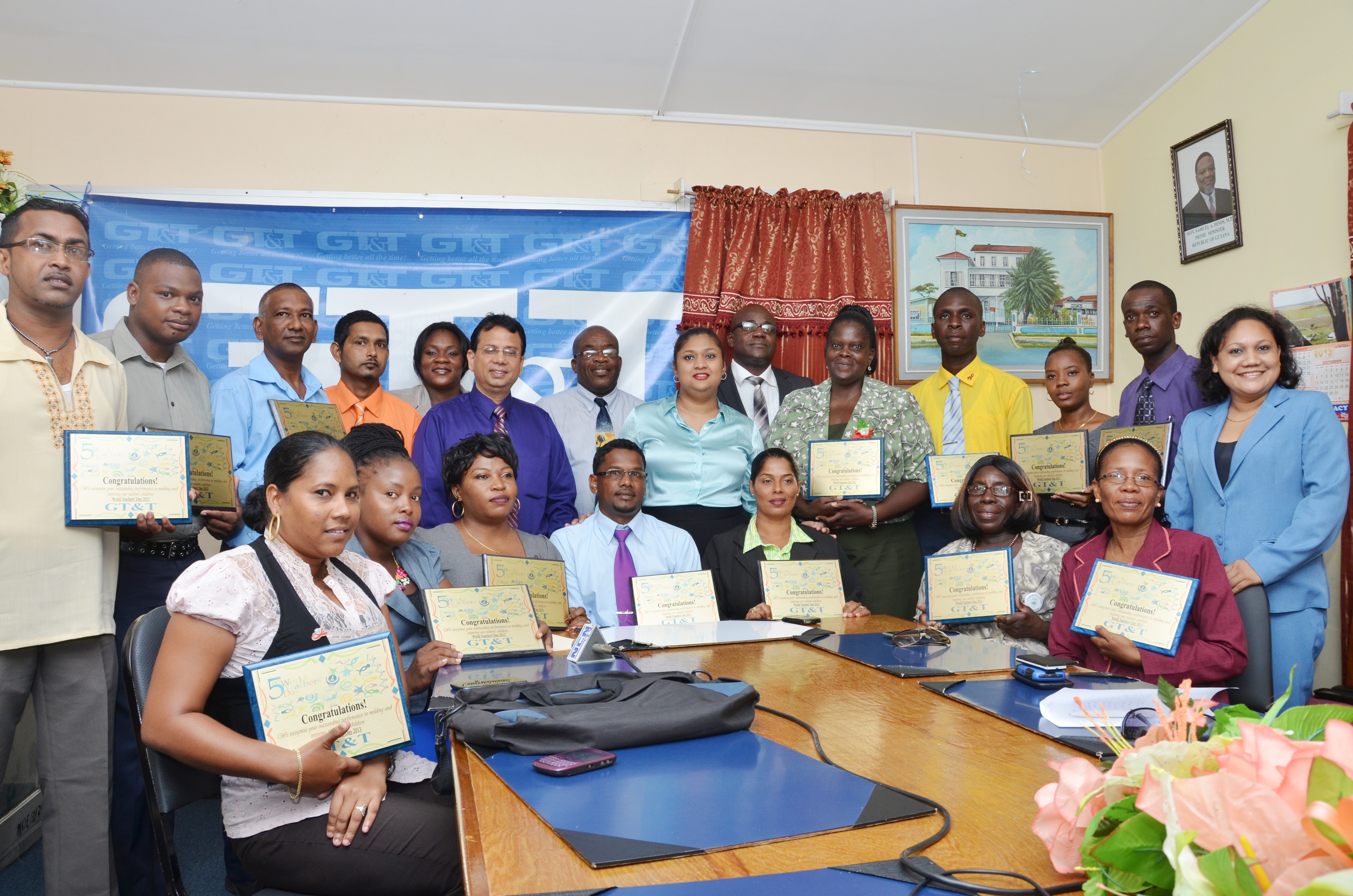 The telephone giant on Tuesday awarded 26 teachers for their outstanding performance and hard work over the years. The teachers were given a plaque of appreciation and Gy$ 5000 worth of phone credit.