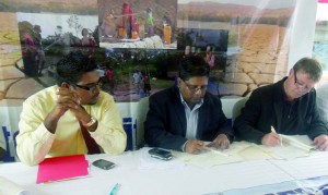Finance Minister Dr Ashni Singh and the Inter- American Development Bank representative Marco Nicola signed two agreements aimed at developing the water sector on Wednesday. The signing was done in the presence of Housing and Water Minister Irfaan Ali, Region 10 Chairman Mortimer Mingo, Housing Ministry Permanent Secretary Emil McGarrell and residents of Linden.