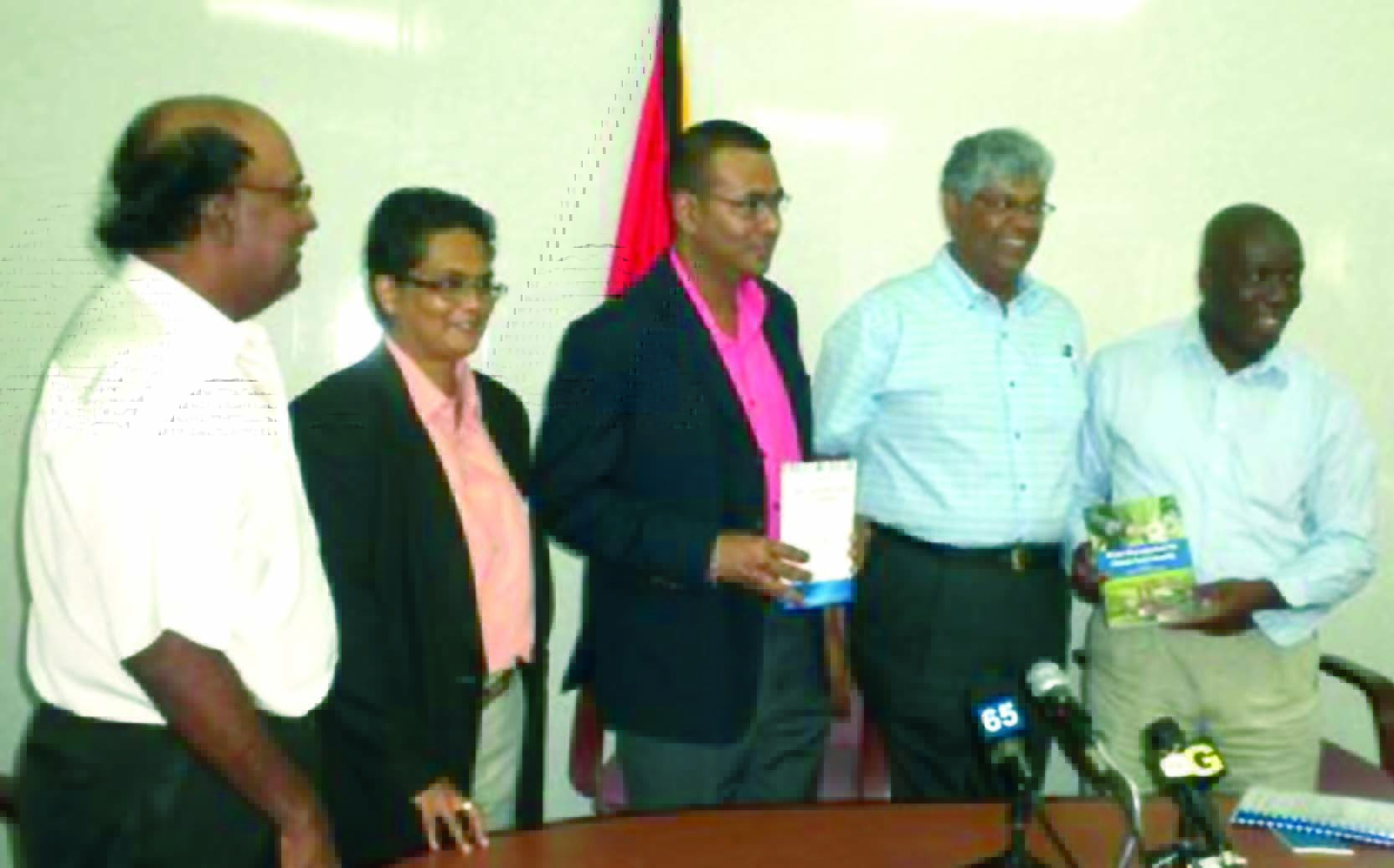 Head of NAREI, Dr Oudho Homenauth, (first from left) along with other Agriculture Ministry officials including Minister Robert Persaud and Dr Chandra Madramootoo pose with his recent book on water management