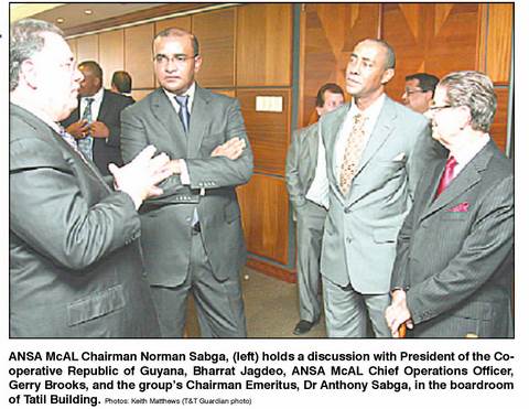 Chairman Emeritus of the Ansa Mcal Group of Companies, Dr Anthony Sabga, has lauded the economic progress of Guyana and points to the huge investment poten-tial of the region’s larg-est territory.Dr Sabga was at the point of responding to the reasons behind his invitation to the presi-dent of Guyana to ad-dress the Directors of the Ansa Mcal Group in Trinidad. The president made amajor presentation to the Ansa Mcal Group and in-vestors in Trinidad at its corporate headquar-ters in Port of Spain last Thursday.Current Chairman of the group, Norman Sabga, pointed to Guyana as the investment des-tination of choice, and revealed that a delega-tion will be visiting the country within the next few weeks as a follow up to the close discussions with President Jagdeo.Sabga spoke of the synergies between Guyana and Trinidad and the positive invest-ment climate which ex-isted in Guyana today.The Ansa Mcal group’s visit to Guyana will fol-low that of another ma-jor business group from Trinidad and Tobagothat has already identi-fied and formally applied for an area where its in-vestment in entertain- ment will be located. Sources close to the Guyana Office for Trade and Investment (GO-Invest) report that there has been an increased and active interest from Trinidad and Tobagobusiness within the past few months. President Bharat Jagdeo has told a group of Ansa Mcal executives that there are huge busi-ness opportunities in Guyana.Speaking just before a business luncheon with executives of the con-glomerate in Trinidad and Tobago on Thursday, Jagdeo said that Guyana had emerged from be-ing a ‘ basket case’ in the Caribbean to become one of the safest places to in-vest. Noting that he hoped to stimulate the already high interest the group has in Guyana, Jagdeo said ANSA McAL Group Chairman Norman Sabga recently visited Guyana, and left with a very good impression of how things were going.“ Guyana had a very difficult time. Our debt situation was one of the worst in the world,” he recalled. “ There was a sense of hopelessness in the country. A report from the Caribbean Council of Churches said there was no sense of identity in Guyana.” He said he had fixed the economy and improved infrastructure. The Trinidad and Tobago Guardian quoted President Jagdeo as say-ing that government had spent quite a bit on in-frastructure, fixing 800 of the 1200 schools and constructing eight new hospitals. He said his government has distrib-uted 80,000 house lots in Guyana.“ Everybody is build-ing, even the cleaners and security guards.Interest rates have gone down, and the country is becoming more politi-cally stable.” One area of opportunity lies in Guyana’s connection to and growing relations with South America, in particular Brazil.Jagdeo said Guyana has a free trade agree-ment with Brazil, and the list of items that can be exported into Brazil has been extended. He said that a bridge has already been built connecting Brazil and Guyana, and there are plans to construct a huge power plant and a deep- water harbour in Guyana.“ I am seeing sever-al Guyanese firms and some foreign ones build-ing warehouses,” Jadgeo said. Further, there are plans to expand the rice industry and move peas-ant farming to large scale agriculture.“ We are exploring for oil and gas now,” he add-ed.