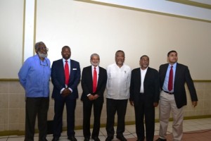 Head of the Presidential Secretariat Dr Roger Luncheon, TATT Vice Chairman Kwesi Prescod, Chief Executive Officer Cris Seecheran, Prime Minister Samuel Hinds, Deputy Chair Cagnay Casinire and Spectrum Planning Management and Monitoring Manager Kirk Sookram at the close of the first day of the public forum on broadcasting