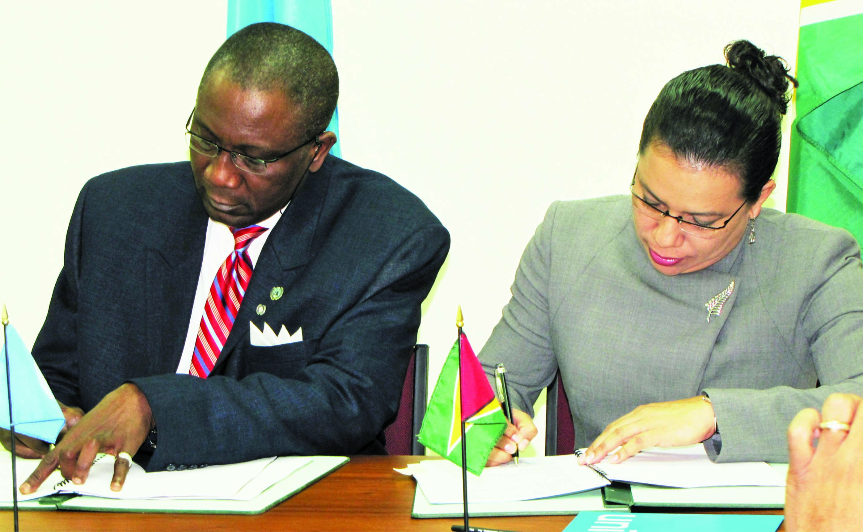 Foreign Affairs Minister Carolyn Rodrigues-Birkett and United Nations International Children’s Emergency Fund (UNICEF) representative to Guyana Dr Suleiman Braimoh on Tuesday signed the Country Programme Action Plan (CPAP), valued at US$ 15.2 million for the period 2012 to 2016 at the Foreign Service Institute.